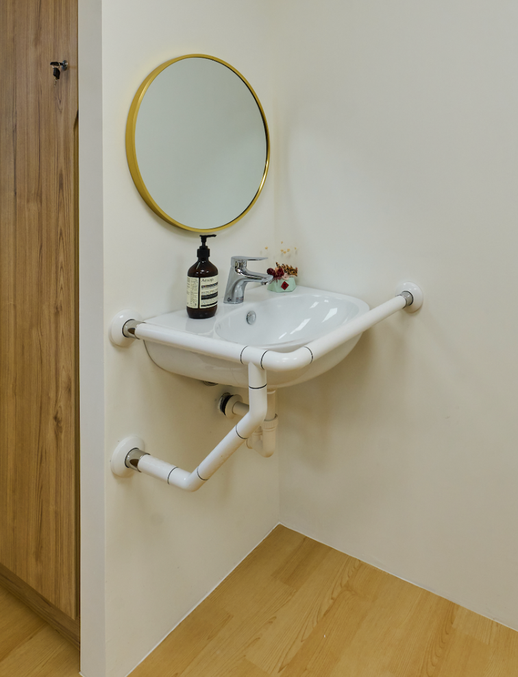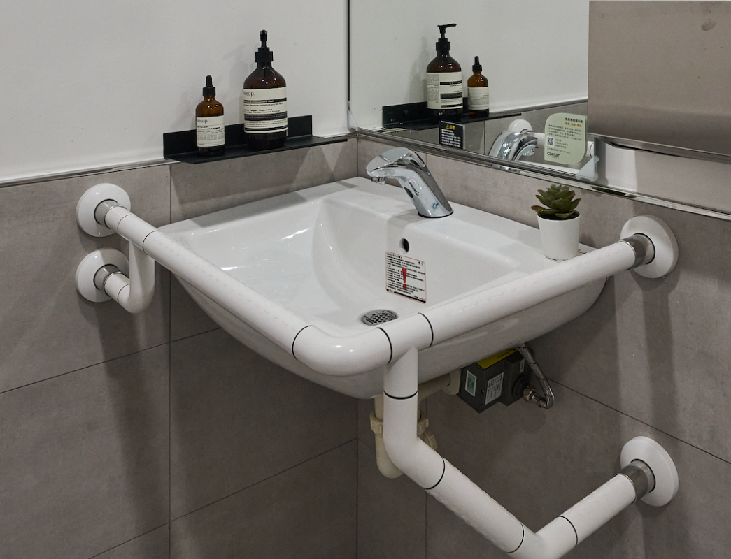 • 洗手台周圍加裝扶手,設置高度考量輪椅使用者方便。